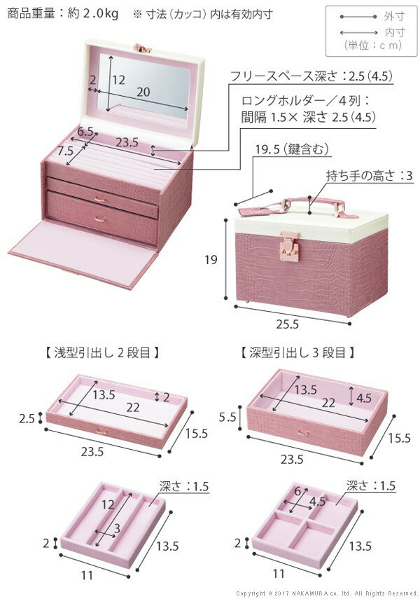【カラーバリエーション】 ブラウン・ピンク 【仕様】 本体・蓋(外貼り):合成皮革(PVC) 内貼り:起毛布 芯材:繊維板 ◎完成品 【サイズ】 幅25.5x奥行19.5x高さ19cm 重量:約2kg ミラーサイズ:幅20x奥行12・フチ2cm 1段目内寸(奥):幅23.5x奥行6.5x高さ2.5cm/有効高さ4.5cm 1段目内寸(リング挿し):幅24x奥行7.5x高さ2.5(5本幅24x奥行1.5)cm 2段目(引出し):幅23.5x奥行15.5x高さ2.5(内寸幅22x奥行13.5x高さ2)cm 3段目(引出し):幅23.5x奥行15.5x高さ5.5(内寸幅22x奥行13.5x高さ4.5)cm トレイ(4分割仕切り):幅11x奥行13.5x高さ2(内寸幅4.5x奥行6x高さ1.5)cm トレイ(3列仕切り):幅11x奥行13.5x高さ2(内寸幅3x奥行12x高さ1.5)cm 持ち手立ち上がり:3cm 株式会社ナカムラ(A0800030)