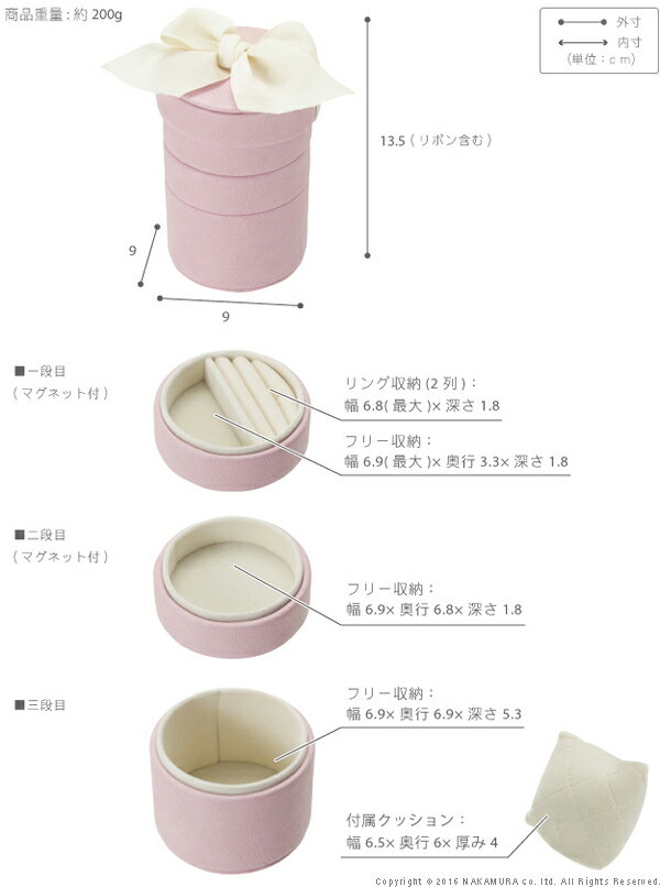 サイズ:幅9x奥行9x高さ13.5cm(リボン含む)・約200gカラー:ホワイト・イエロー・コーラルピンク・ピンク・サックスブルー材質:本体(外貼り)-合成皮革(PVC)、内貼り-起毛布、芯材-紙芯完成品株式会社ナカムラ(A0800021)