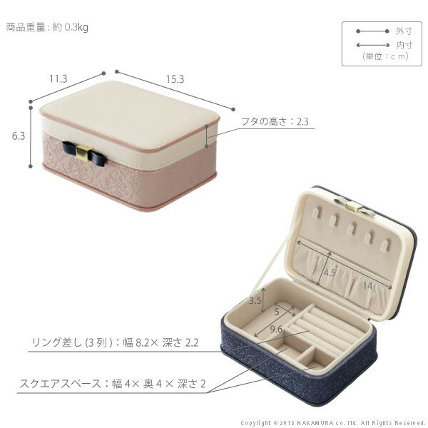 サイズ:幅15.3x奥行11.3x高さ6.3cm・約0.3kgカラー:ピンクベージュ・ロイヤルネイビー材質:本体(外貼り)-合成皮革(PVC)、内貼り-起毛布完成品生活関連グッズ ジュエリーボックス アクセサリーケース 収納 持ち運び プチジュエリーボックス 小物入れ ギフト ネックレス 指輪 ピアス コンパクト ロイヤルネイビー※入荷状況により、発送日が遅れる場合がございます。
